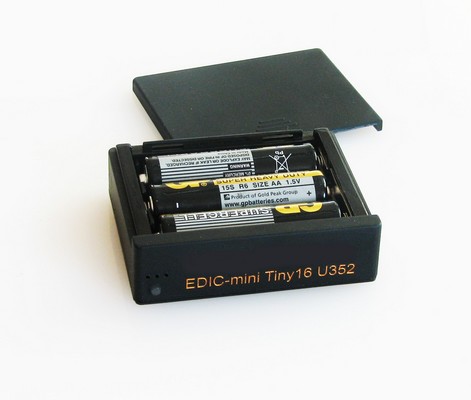 Edic-mini Tiny 16 U352 is powered by three common AA batteries providing continuous recording up to 305 hours. The recorder is also compatible with widespread AA rechargeable batteries that can be charged by a common cheap charging device.